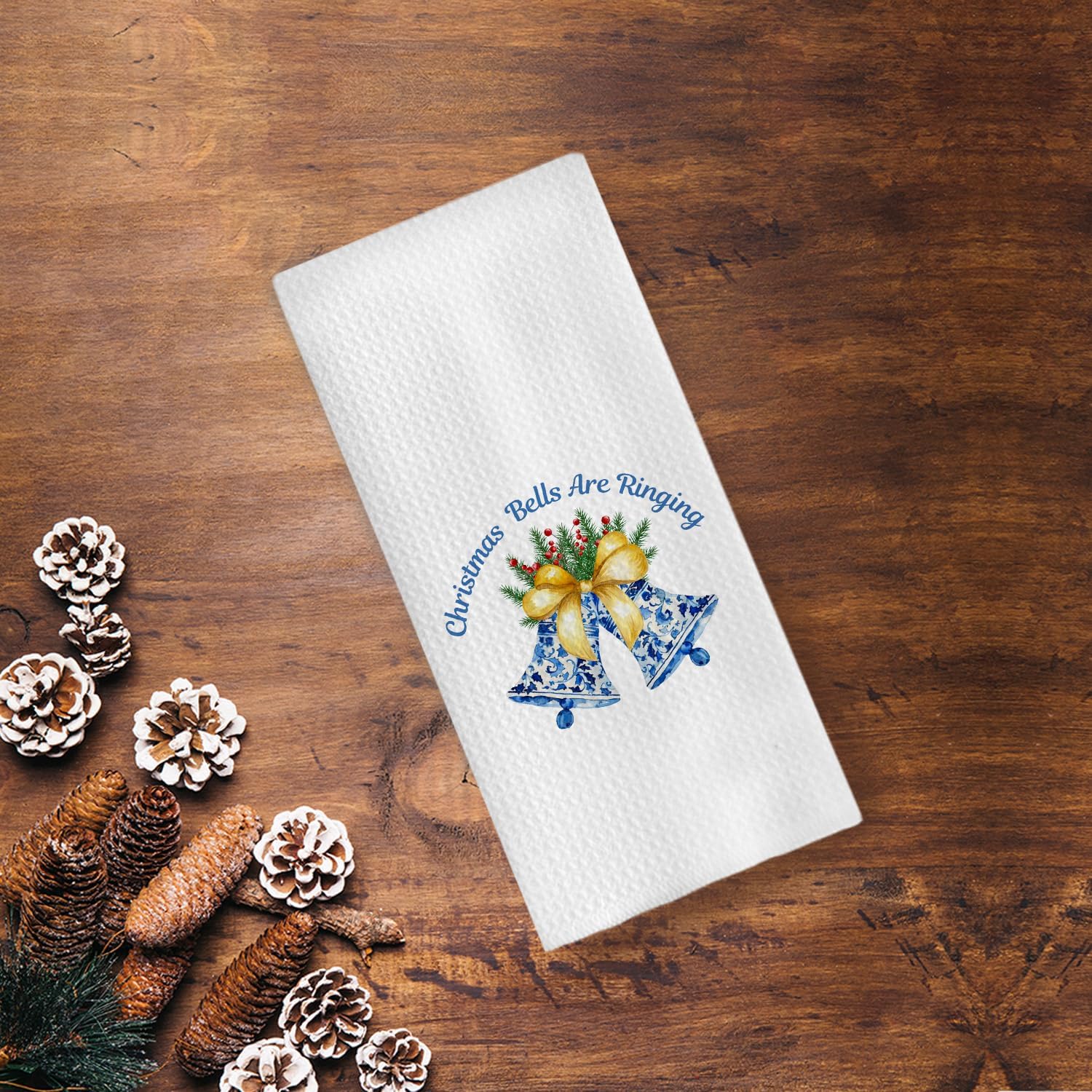 Christmas Bell Kitchen Towels - Chinoiserie Coquette Christmas Decorative Waffle Dish Towels, Blue and White Coquette Hand Tea Towels for Kitchen Bathroom, 16x24 Inch
